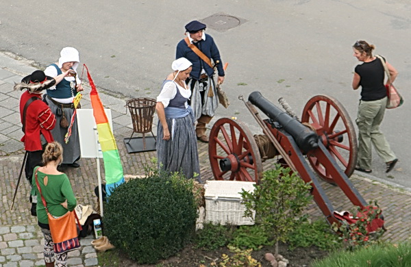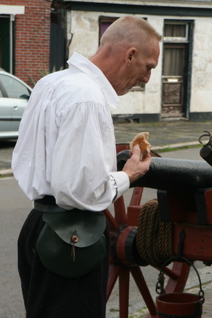 Voor de molen waren leden van een historische verkleedclub bezig zich in tenues te hijsen die doen denken aan de tijd van de Tachtigjarige Oorlog. Gegeten moet er echter ook worden! Het kanon is oud, het broodje vers… (Molenaar Drewe Schouten vertelde dat het kanon niet mocht worden afgeschoten, want dan zouden er te veel ruiten sneuvelen… Voor de musketten was wel een vergunning aangevraagd en verkregen.)