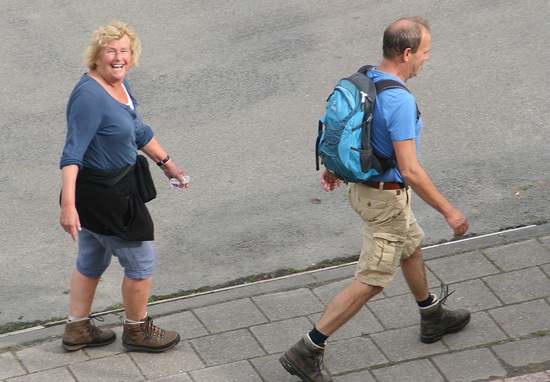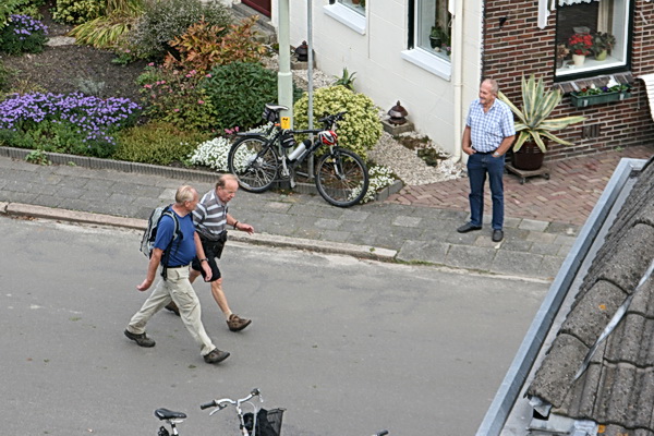 Deze wandelaars, in druk gesprek gewikkeld, zetten er stevig de pas in. Dat ziet ook overbuurman Taeke Jager, die dat wandelen prima vindt, zolang een ander ’t doet….