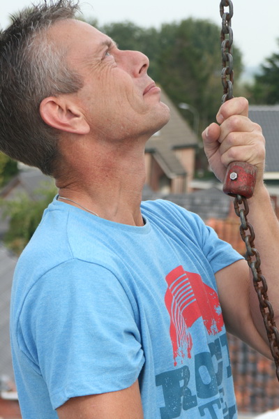 Geen wandeltocht voor vrijwillig molenaar (in opleiding) André Bood! Hij houdt de wieken in de gaten, er worden nog snel vlaggetjes aan bevestigd!