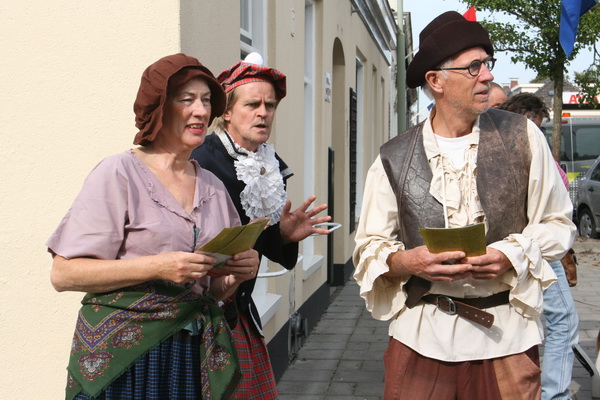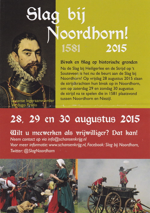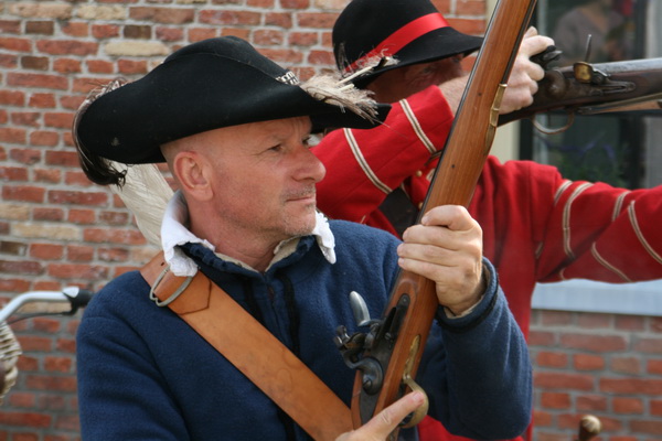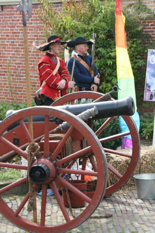 De musketiers staan waakzaam nabij het kanon, terwijl een wandelaar alvast kennis neemt van de inhoud van de flyer over de Slag bij Noordhorn, in augustus 2015…