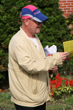 Heer Pieter, van de Dijkstra State aan het Hamsterpad, is ook ijverig bezig met de flyers kwijt te raken aan al of niet geïnteresseerde wandelaars….