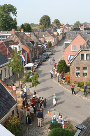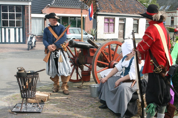 De musketiers zoeken een moment verpozing bij de vuurkorf, en bij de marketentster, beide warmte gevend… Het kanon staat nu in de richting van de Langestraat, waar de wandelaars vandaan komen….