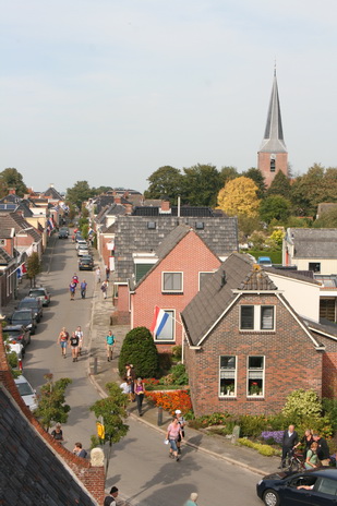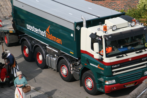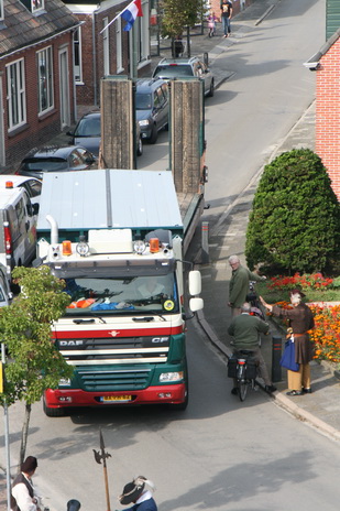 Een wandelaar leest al lopend de uitgedeelde flyer. Wel uitkijken, want er huist af en toe gevaar in de Langestraat, zoals hier bij het passeren van de vrachtwagencombinatie van Oosterhof/Holman. In het tunnelgebied wordt geasfalteerd, een concurrerende bezigheid…