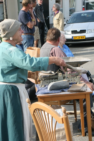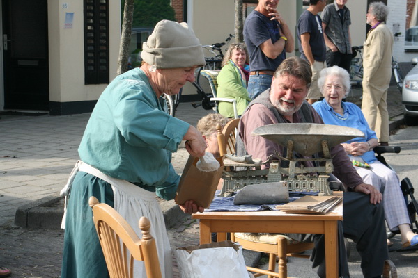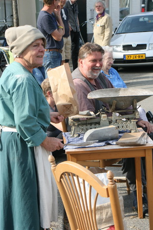 Het afwegen van het meel, een kwaliteitsproduct van “Fortuna”, gaat uitstekend. De verkoop loopt minder vlot, al doet de WAARKster haar uiterste best. Erg veel hulp van de man aan haar zijde krijgt ze trouwens niet…. (Valt me tegen, Geert!)