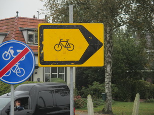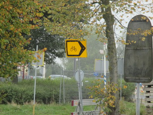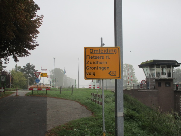 Het zal misschien voor de elektrisch aangedreven fietsen heel logisch zijn, deze omleiding… Je komt aan de noordkant van het kanaal uit de richting Koopman Transport bij de brug, je ziet dat je niet rechtsaf kunt (verleggen en vernieuwen leidingen in verband met de vervanging van de tafelbrug in 2015), je wordt de kant van Noordhorn op gestuurd.