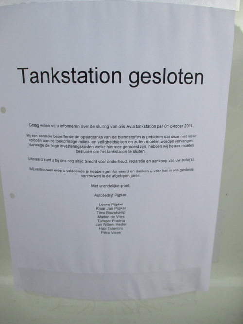 Van Koos Westra de vorige week gehoord dat de benzinepomp van Garage Pijpker dicht is. “Er staat een brief op de pomp”, aldus Koos. Goed om het hier ook te vermelden. Voor een dorp toch een verlies!