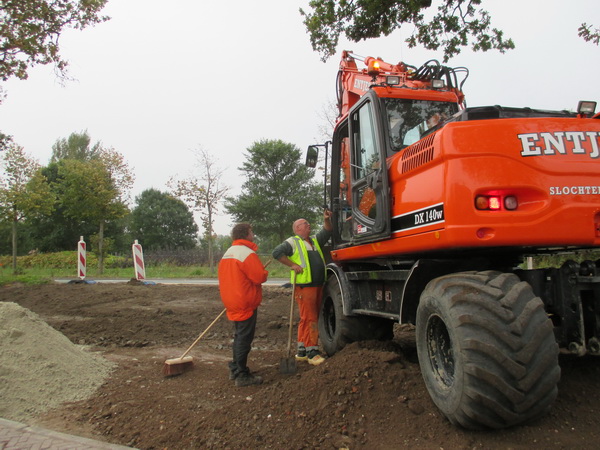 Mooie Entjes-kraan! Het asfalt van de tijdelijke afslag is verwijderd. Nee, niet met bezem en schep….