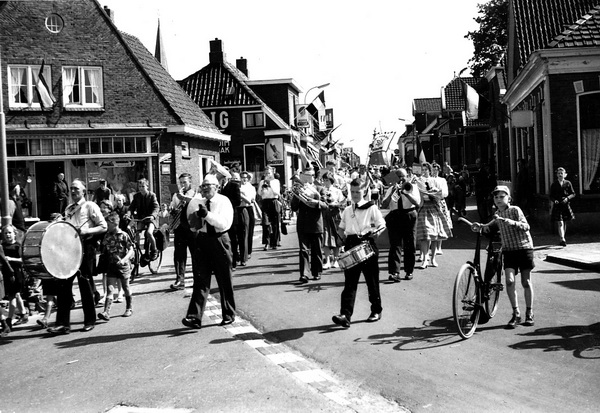 Er zijn meer foto’s gemaakt in 1959 van het openingsfeest van de speeltuin. Hier alvast nog eentje, met hetzelfde muziekkorps, maar op een andere plaats: Op de hoek van de Langestraat (midden) en de Nieuwstraat, waar winkelier Beukema in de deur van zijn zaak staat…: