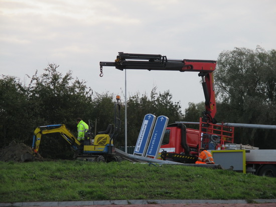 De grote lichtmast met blauwe handwijzer (vroeger het privilege van de ANWB….) is “gestreken”. Voor onderzoek? Reparatie? Moeten er al weer nieuwe lampen in? Zenuwslopende bezigheid blijkbaar, een van de werkers neemt eerst even “wat tied veur n pafke….”