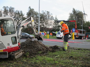 Gegraaf in de berm tussen fietspad en nieuwe weg (die rotonde verbindt met de Industrieweg en oude N355)