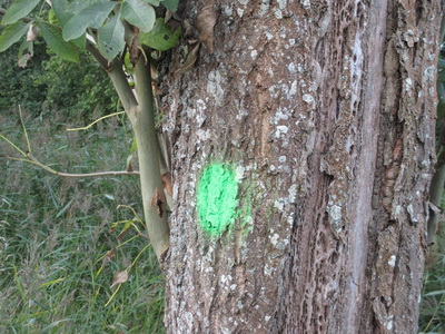 Het begin van de Mokkenburgweg vanaf de Transportweg. Drie bomen (essen) die gemerkt zijn met een groene stip. Groene stip? Wat betekent dat? Toestemming om door te gaan met groeien? Of toestemming voor de wegbeheerder om flink te snoeien? Te kappen? Verwarrend…..