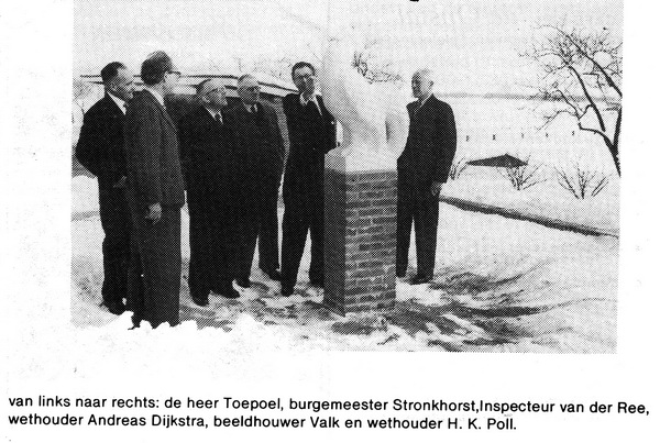 Heel wat hoogwaardigheidsbekleders bij elkaar op de foto in winters Noordhorn, rond het beeld dat kunstenaar Willem Valk maakte: de befaamde haan. Toén ‘achter de school’, aan de zuidkant; tegenwoordig staat het dier, grijs geworden, bij de voormalige hoofdingang aan de Oosterwegzijde.