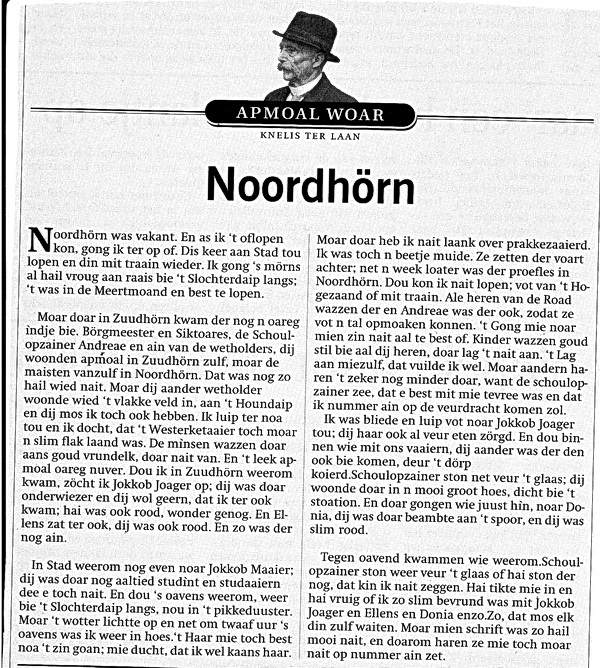 Een soort column van de hand van Knelis ter Laan in de reeks APMOAL WOAR, eentje over Noordhörn! In t (Oost-) Grunnegers! In welke krant de bijdrage verscheen, weet ik helaas niet… Ik vermoed begin jaren negentig in het Nieuwsblad van het Noorden, een herdruk…..
