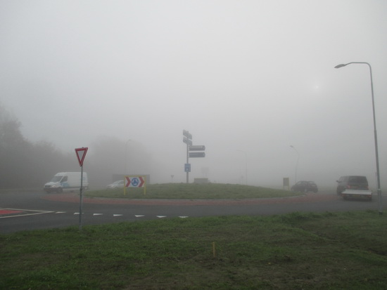 Rotonde in de mist. De tunnelingang ligt verborgen achter een grijs gordijn….