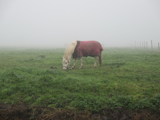 Pony in de mist, aangekleed…..