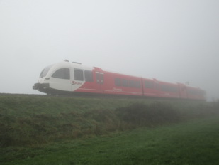 Ook in de mist, keurig op tijd, eerst de trein vanuit Leeuwarden, niet veel later de trein vanuit Groningen….