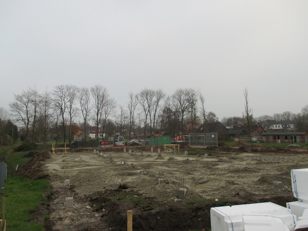 Terug naar de Industrieweg, naar de bouwput van BE-JO, waar Kode Profiel uit Marum de bouw voor haar rekening neemt (in opdracht van de fa. Kooi?!) Er zijn flink wat palen geheid en “gekopt”. Bovendien zijn er vele karren vol speciaal zand aangevoerd. Er moet nog meer bij.