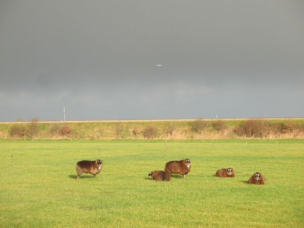 Bruine Datema-schapen, een overvliegende gans, bijzondere atmosfeer…..