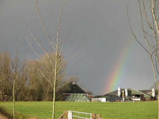 Ja, dat herwonnen lichaamsgewicht in deze consumptieweken rond Kerst en Oud en Nieuw wil ik grotendeels weer kwijt en dan is het zaak dagelijks minimaal twee keer “minstens een half uur…” de ene voet voor de andere te zetten. Geen straf, zelfs niet als tijdens onze wandeling langs het kanaal een donkere lucht zich vrij gezwind in onze richting begeeft (en wij parapluloos de confrontatie aangaan…) Een regenboog zorgt voor het contrast, fleurt de duisternis op, kleurt zelfs de regendruppels: