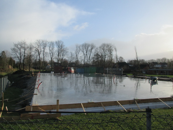 Hier komt de nieuwe hal van technische handelsonderneming BE-JO. De vloer is gestort en vlak gestreken met de vlindermachines. Nu lijkt het een waterbaan… Op de achtergrond het werkterrein van J.B.Z. (Jan Balkema Zuidhorn).