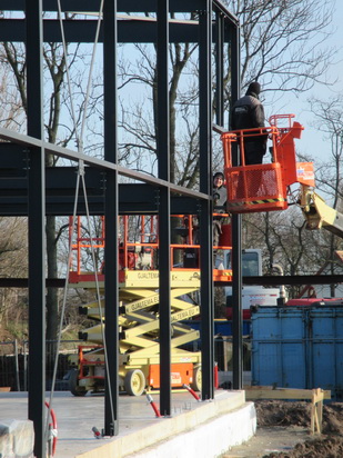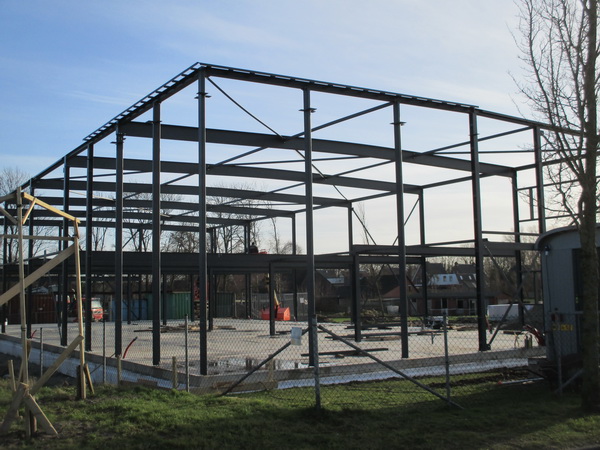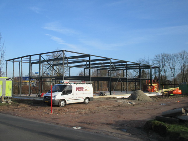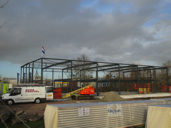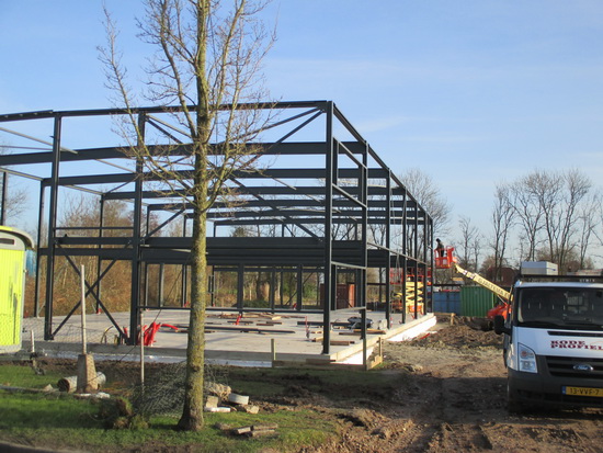 Gelukkig, eindelijk weer eens een dag dat je uit de voeten kon zonder regenjas en/of stormparaplu… Zelfs de zon erbij! Twee keer de benen gestrekt, o.a. langs de Industrieweg waar de nieuwbouw van de BE-JO loods zienderogen vordert. Het hoogste punt is bereikt, vlag in top! (Nee, geen kerstboom….)