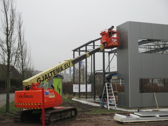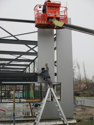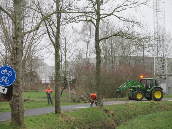 Twee keer “in de benen” geweest, een keer tegen de wijzers van de klok in, de tweede keer andersom… Beide keren een serie foto’s gemaakt. Eerst bij de bomenkap aan de noordkant van de Mokkenburgweg, waar de motorzagers van de Gemeente Zuidhorn de groen gestipte essen een boom(pje) kleiner maakten. Daarna, en ook ’s middags, bij de bouwers van Kode Profiel die aan de Industrieweg de nieuwe hal van BE-JO in elkaar zetten, plaat voor plaat…: