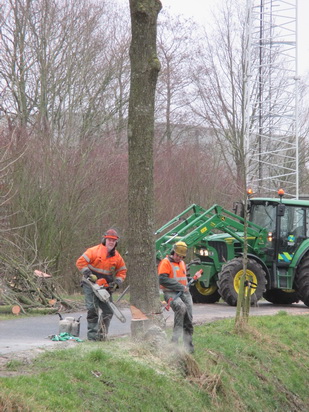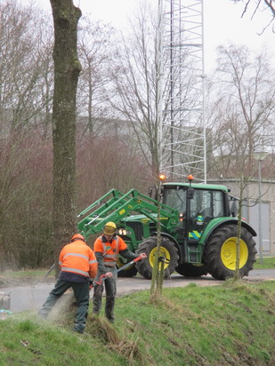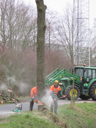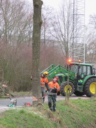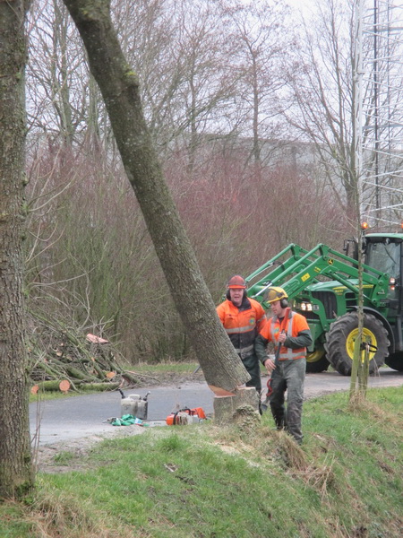 Het noordelijke deel van de Mokkenburgweg is vakkundig afgezet met bedrijfswagen en tractor. Twee Openbare Werkers van de Gemeente Zuidhorn zijn bezig een groen gestipte es neer te halen. De boom lijdt aan de essentaksterfte, is ten dode opgeschreven….