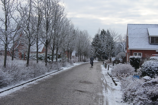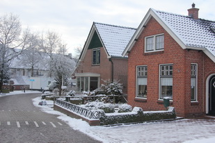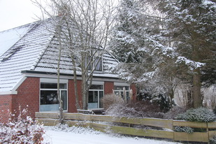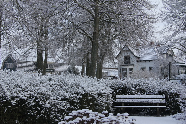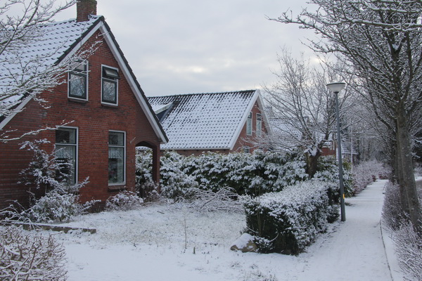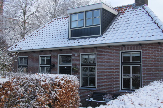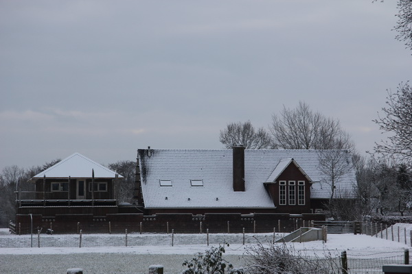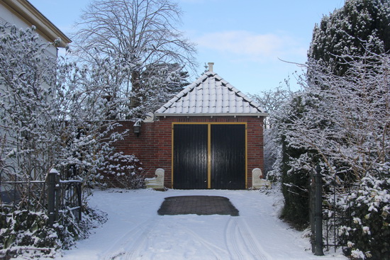 Winterse blik op de fraaie garage naast het oude, maar stijlvolle pand van Wijnand de Boer, en Anneke Bouwmeester. Markering in de sneeuw waar de auto stond…..
