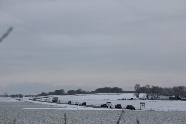 Vergezicht van achter de woonboerderij de Sicke Benninghestede richting de verlegde N355 en de helling van de nieuwe, vaste hoge brug… Op de straatweg een eenzame QBuzz-bus…