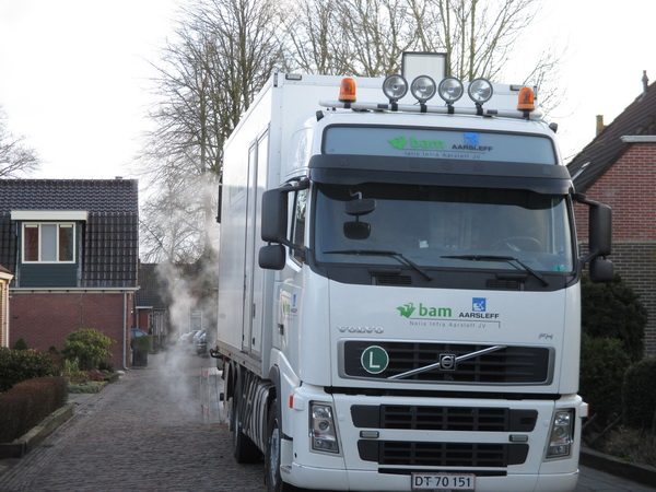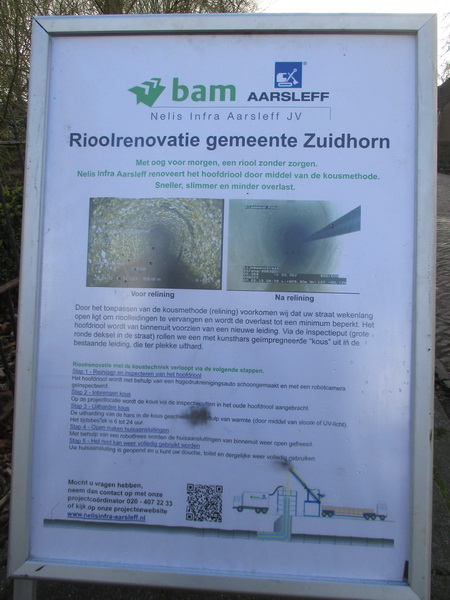 “Wat een stank!” en “Wat een stoom!” De afgelopen dagen waren deze uitroepen vaak te horen in en bij diverse Noordhorner straten. BAM is bezig met het vernieuwen van het hoofdrioleringssysteem. De straat wordt niet meer open gelegd, nee, er wordt een “kous’ ingebracht…. Enfin, het staat allemaal op het informatiebord dat steeds in de buurt staat van de BAM-vrachtwagen:
