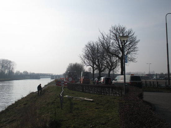 Een paar beelden van de werkzaamheden aan de weg langs het Van Starkenborghkanaal, aan de noordzijde, ter hoogte van het parkeerterrein van Koopman Transport. De tijdelijke straatklinkers zijn uit de gehavende weg gehaald en de mannen van Oosterhof Holman (Grijpskerk) hebben de asfalteermachine in werking gezet. (De plek waar de weg open heeft gelegen in verband met het verzinken van de nieuwe buizen van Gasunie en Enexis. Dieper liggend dan de oude buizen, de vaarroute Lemmer-Delfzijl ook in dit opzicht geoptimaliseerd).