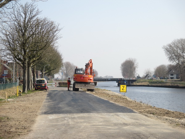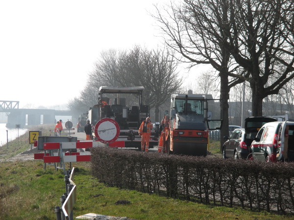 Woensdag 18 maart – De mannen van Oosterhof Holman zijn aan het asfalteren. Links een provincie-medewerker die een foto heeft genomen. Kieker gekiekt….