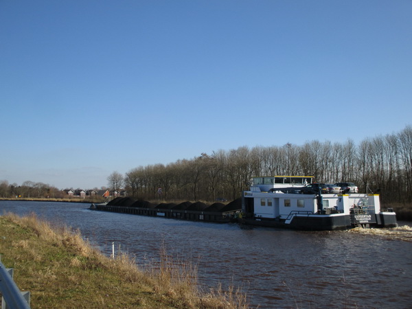 Er is een regelmatige aanvoer van grote bakken met steenkool, met een stevige duwer er achter, zoals hier de ARIES. Op weg naar de Eemshaven??!