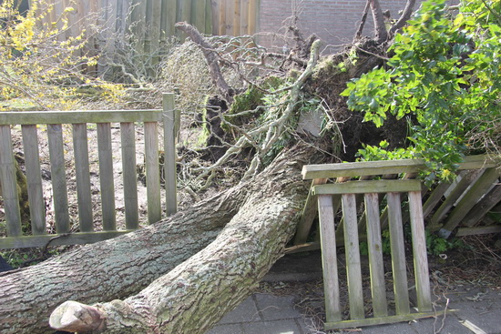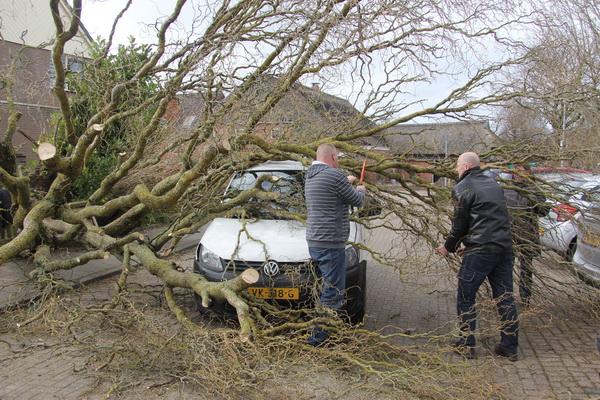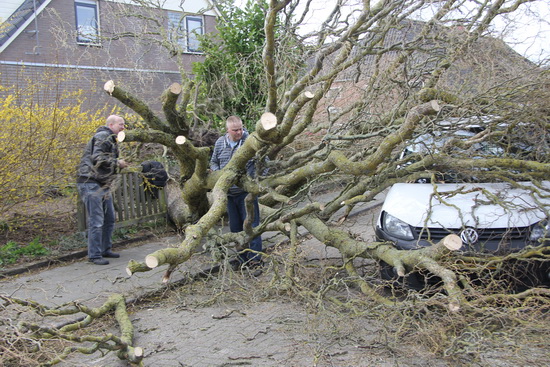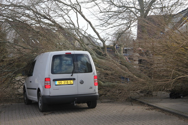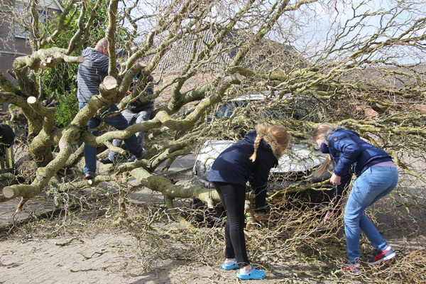 Dat was me het dinsdagje wel… Een zware storm veroorzaakte talrijke ongewenste taferelen: Bovenleiding spoorlijn kapot bij Beilen, omgewaaide vrachtauto’s, koepel van grasmaaier Mulder zijn Meubelhal gewaaid in Vriescheloo en in onze eigen woonplaats? Vanmiddag een telefoontje van plaatsgenoot Marco Kooi: “Boom omgewaaid bij ’t Kompas, op een auto. Ik dacht, ik bel even….” Op naar de omgewaaide boom, met dank aan Marco!