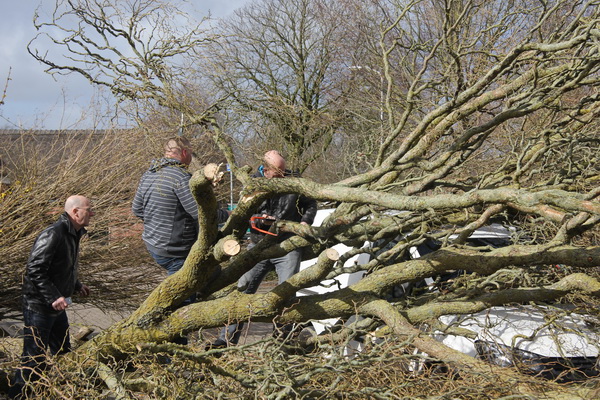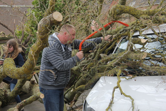 Gelukkig, de chauffeur van de auto (links met leren jas) is niet gewond geraakt, al zal hij zich zijn laatste dag als Noordhorner anders hebben voorgesteld… Bezig met het verhuizen van een laatste rest inboedel en dan word je zo door de storm uitgeluid….