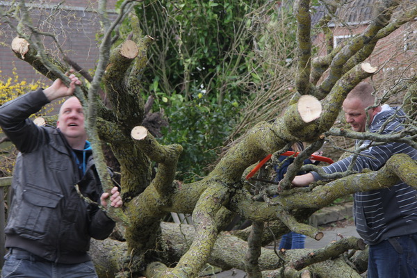 Hulpvaardige handen van buurtbewoners helpen met takkenzaag en takkenschaar. Er valt heel wat te zagen en te knippen….