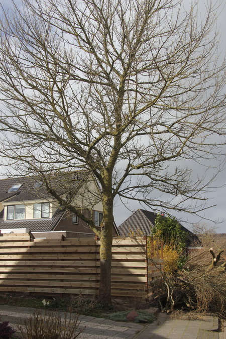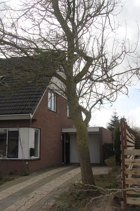 Hier is het dus, aan het noordeinde van de Esdoornstraat, bij het allereerste huis aan de westkant, VERKOCHT getuige het bord van de makelaardij….. De boom komt trouwens uit de tuin van de woning op de hoek van de Moeshorn…..