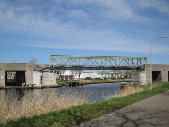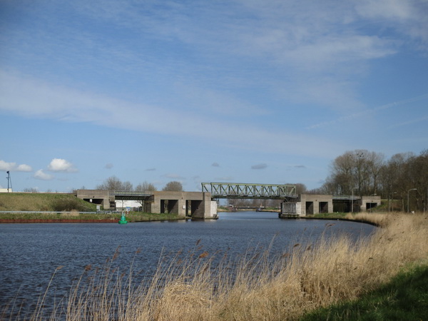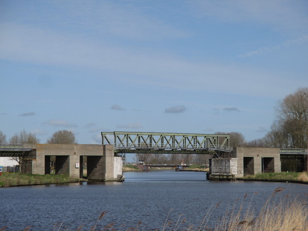 Vanaf de zuidkant van het kanaal zicht op de twee bruggen: spoorbrug en verkeersbrug (die vaak tafelbrug wordt genoemd)