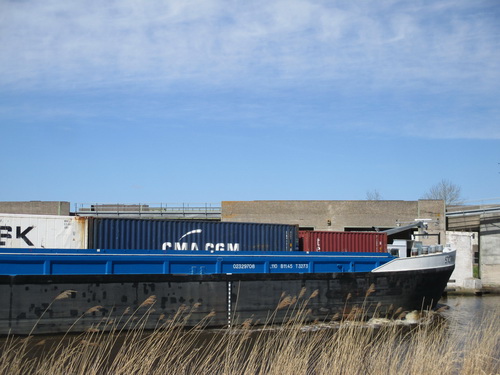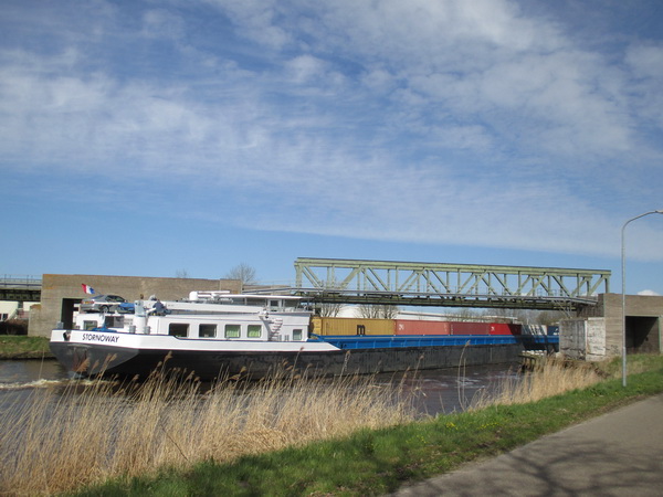 Bijna geruisloos komt een grote binnenvaarder langszij, de “Stornoway”, maximale maten voor deze wateren, tonnage: 3273 !