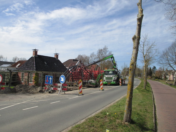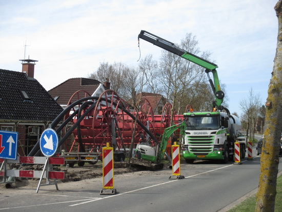 Aan de westkant van de N355 is de firma Van de Beek druk bezig vier leidingen tegelijkertijd onder het kanaal door te boren, computergestuurd. Er staan dan ook vier forse haspels. Eigenlijk ben ik aan de late kant, de haspels zijn al leeg… Ik had op de heenreis alerter moeten reageren…