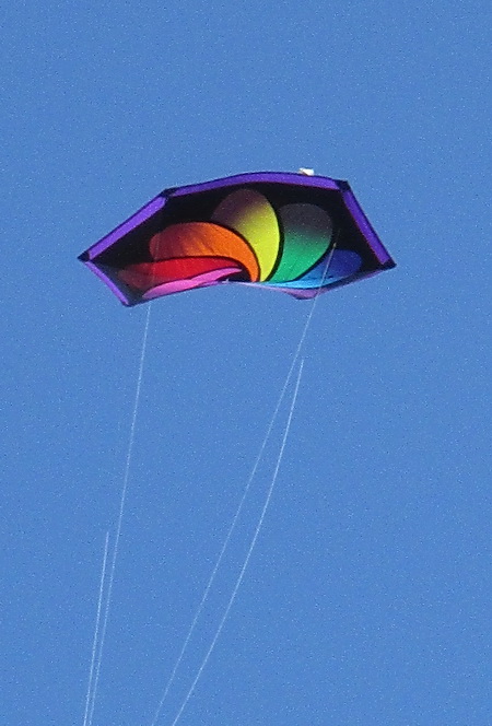 Zaterdagmiddag 18 april viel mijn blik ineens op iets kleurigs, iets fleurigs tegen de strakblauwe lucht…. Nee, geen Jozua Stenekes met zijn nieuwe vliegmobiel, maar een immense vlieger, stabiel aan de hemel staand….. En wie houdt de touwtjes vast??!
