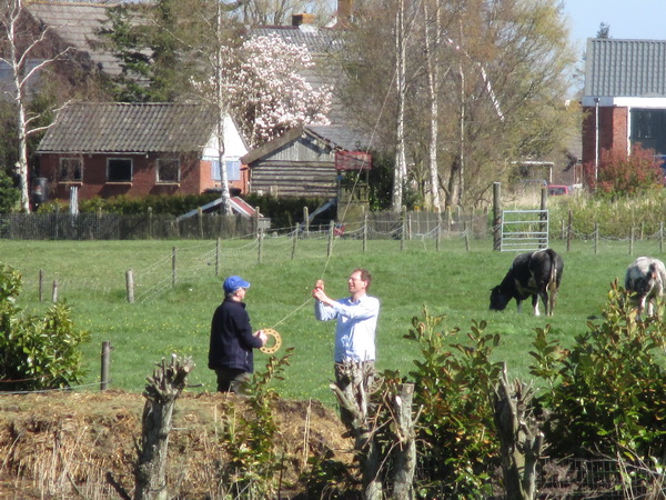 De man met de haspel (nee, hij heeft mijn pet niet geleend…) herken ik niet. De ander wel, dat is onze Noordhorner wetenschapsman inclusief uitvinder Pieter Meulenhoff, uit de Nieuwstraat. Op het weiland van de familie Haas?! De koeien trekken zich er niet veel van aan…