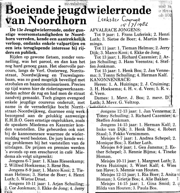 Kom ik een knipsel tegen, uit de oude en toen zo vertrouwde LEEKSTER COURANT, hét weekblad voor de regio’s Westerkwartier en Noordenveld. Dacht ik altijd dat er in de jaren zeventig een eind was gekomen aan de jeugdwielerrondes in Noordhorn Noord… Maar hier is een verslag + uitslag van de 13de Jeugdwielerronde, juli 1982! Bijna 33 jaar geleden. Helaas, hiervan heb ik geen foto’s: