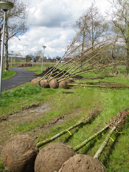 Als we langs het noordelijkste stuk van de Mokkenburgweg lopen, zien we jonge bomen met kluit liggen, bedoeld voor de aanplant bij de rotonde en de uitrij richting Niezijl en Grijpskerk. Verheugend!