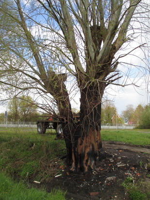 Een ‘wonder’ dat deze door een oudejaarsdagfik mishandelde boom nog weer blad zet…. De houtwal langs de rand van het vroegere Sip-weiland zal worden verbeterd.