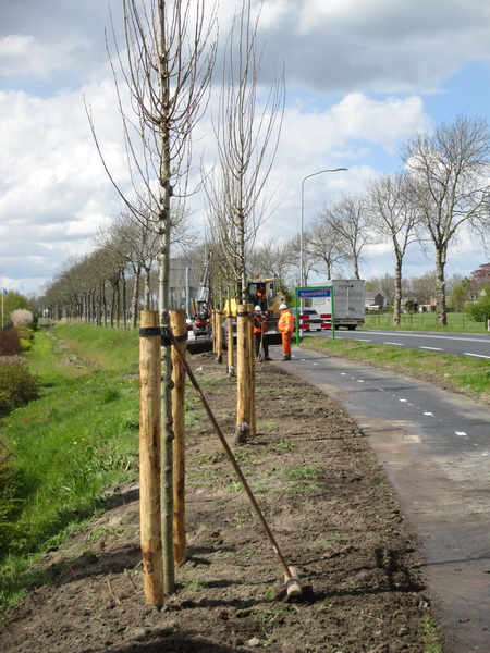 Het fietspad richting Langestraat Noord, Niezijl en Grijpskerk is afgesloten. Er wordt door planters van Mechielsen gewerkt aan de nieuwe bomenrij. Een zichtbare verbetering! Wat voor bomen??! Hier staan jonge iepen, bij de ronding ter hoogte van de rotonde komen esdoorns.