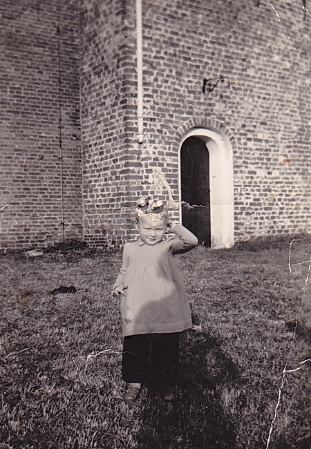 Een piepjonge Tineke Zuidema bij de Hervormde Kerk in Noordhorn. Wat heeft ze daar op haar hoofd??!