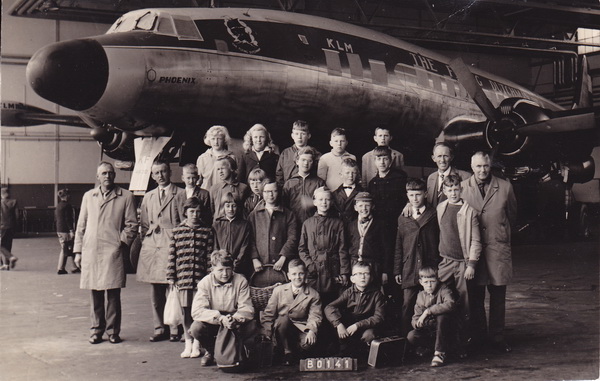 Het jaar? Waarschijnlijk 1962, of 1963…. Bekende groepsfoto van de oudste klassen van de OLS Noordhorn voor het vliegtuig op Schiphol. Rechts hoofdmeester Ale Dijk, bijgestaan door Groeneveld, Hiemstra en Wieringa? Nee, veel kinderen herken ik niet zo een twee drie… Het meisje met de mand is Tineke Zuidema en de dochter van Groeneveld herken ik ook. Staat Fokke Hiemstra hier ook op?!