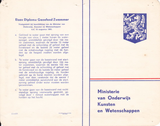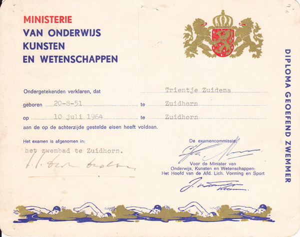 het zwemdiploma van Tineke Zuidema als geoefend zwemster, in juli 1964 behaald, vrij vlot na haar eerste zwemdiploma.