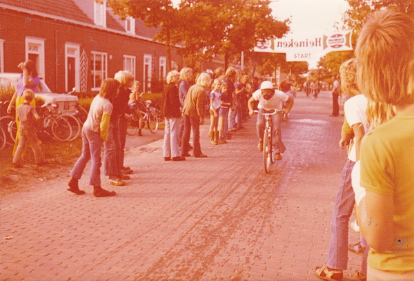 Een foto die niet kleurvast is gebleken, maar wel de sfeer van Noordhorn Toén goed weergeeft. Een beeld van het oudste gedeelte van de Verlengde Oosterweg, aan de noordkant. Daar waar de eerste huizen in deze ‘uitbreidingsstraat’ werden gebouwd door aannemer Potjegort. Waar vroeger Ubel en Hiekje Triemstra hebben gewoond, Luit van der Velde, de families Koop, Veenstra, Zuidema……Daar was in de jaren zeventig en begin jaren tachtig start en finish van de Jeugdwielerronde Noordhorn! Voor de organisatie tekenden Hendrik en Diene Miedema, van café “’t Hertenkamp”, ondersteund door leden van de sociëteit “Concordia” als Jelte Bansema, Maarten Postema, Wiebe Jonkman, Jasper Scholtens… Het stratenparcours werd gevormd door de Verlengde Oosterweg, de Norritsstraat, de Noordwijkweg en de Touwslagersbaan. Er werd gereden op gewone fietsen zonder versnellingen, niet op racefietsen. De schooljeugd deed in grote getale mee, ondanks de kans op valpartijen. Een speciale attractie vormde de Kanonnenrace, waarvoor extra publiek zich om het parcours schaarde. Getrouwd of niet getrouwd, ouder of nog jong van jaren, er waren altijd liefhebbers die mee wilden doen. (Eerder hebben we al eens een racende Pierre Eijgelshoven laten zien, zijn vuurdoop als nieuwe ingezetene). Bij de Kanonnenrace was het gebruikelijk, zeker als de omstandigheden zomers waren, om de deelnemers bij de laatste doorkomst te trakteren op verkoelend water. Op de foto duidelijk herkenbaar.